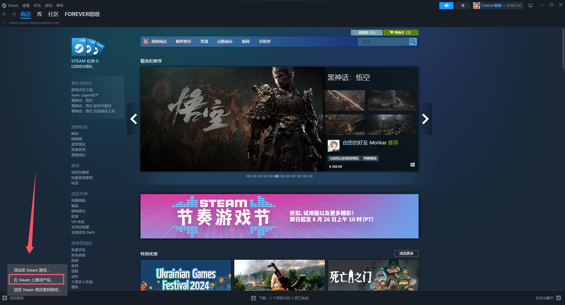 4.选择 在Steam 上激活产品,输入代码即可激活完成